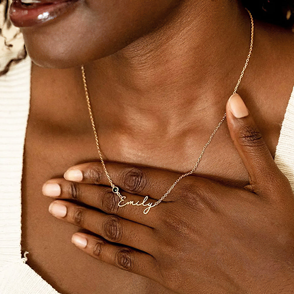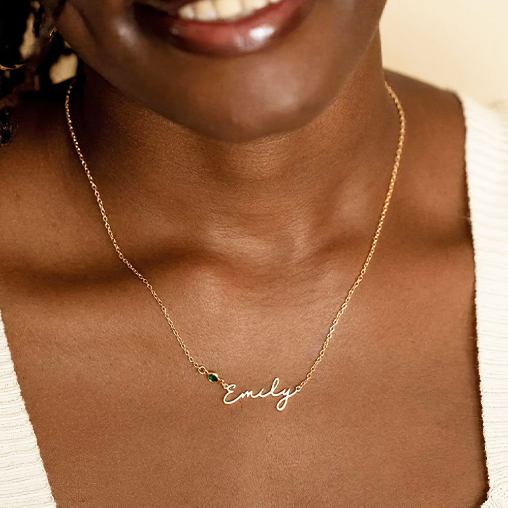 Shine with a necklace that’s more than just jewelry – it’s a celebration of your identity or someone you love. This handcrafted name necklace is beautifully accented with a sparkling birthstone, symbolizing the month of birth and meaningful life moments. Each flowing letter, paired with the gleam of the stone, creates the perfect personalized gift for birthdays, anniversaries, or any treasured occasion. More than an accessory, it’s a heartfelt keepsake worn close to the heart every day.