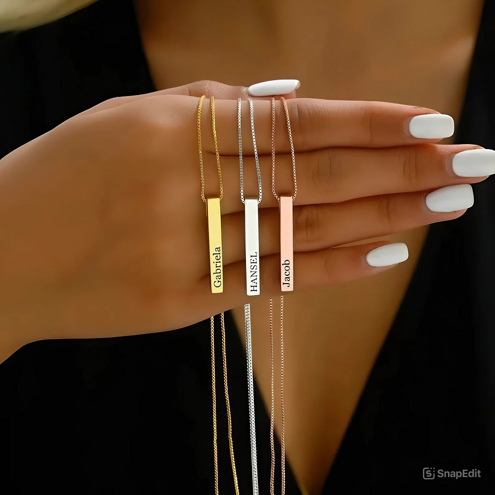 Elegant, modern, and deeply personal — this Personalized Vertical Bar Necklace transforms your cherished names, dates, or special words into a timeless keepsake. Its minimalist design and high-precision engraving make it a versatile accessory for daily wear or a heartfelt gift for birthdays, anniversaries, weddings, or any moment worth remembering.